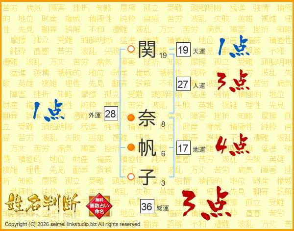 生活面を象徴する運勢です。外部から受ける影響力を表し、結婚運、家庭運や職場、環境への順応性を表します。総運から人運を引いた画数。姓や名が1文字の場合を除く。