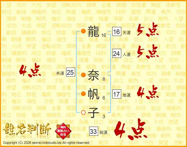 龍奈帆子さんの総運は33画の4点!