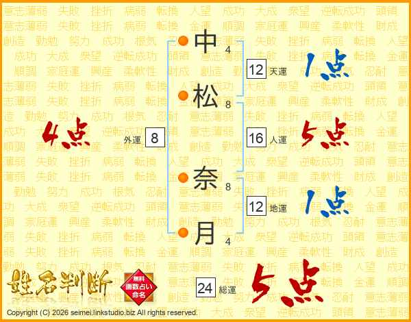中(4画)松(8画) 奈(8画)月(4画)