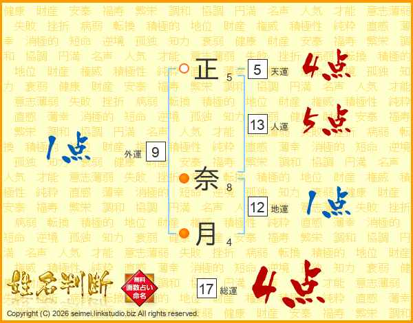 正(5画) 奈(8画)月(4画)