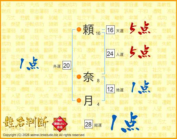 頼(16画) 奈(8画)月(4画)