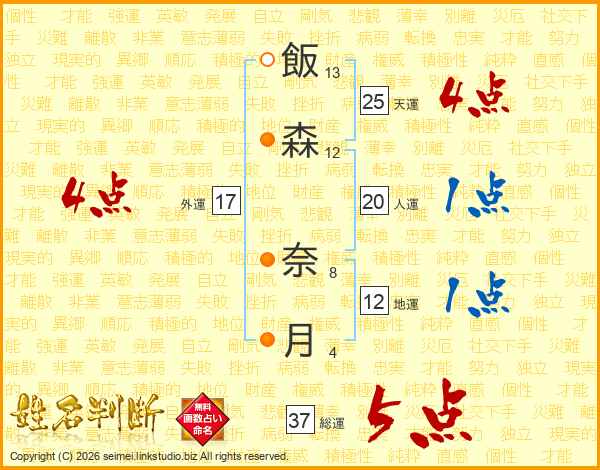 飯(13画)森(12画) 奈(8画)月(4画)