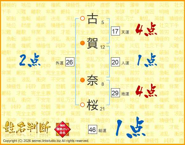 古(5画)賀(12画) 奈(8画)桜(21画)