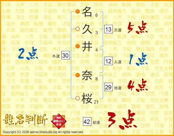 名(6画)久(3画)井(4画) 奈(8画)桜(21画)