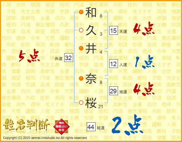 和久井奈桜さんの総運は44画の2点!
