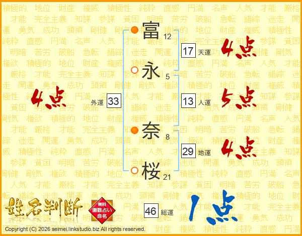 富(12画)永(5画) 奈(8画)桜(21画)