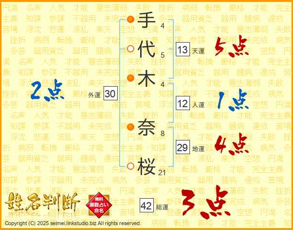 手(4画)代(5画)木(4画) 奈(8画)桜(21画)