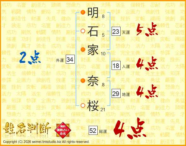 明(8画)石(5画)家(10画) 奈(8画)桜(21画)
