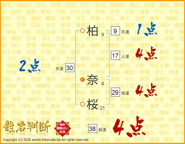 柏奈桜さんの総運は38画の4点!