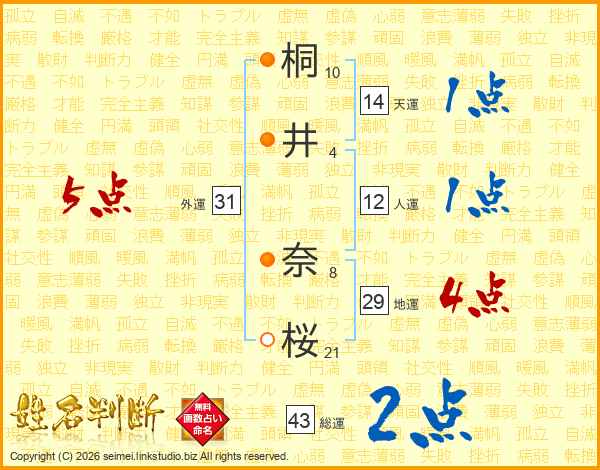 桐(10画)井(4画) 奈(8画)桜(21画)