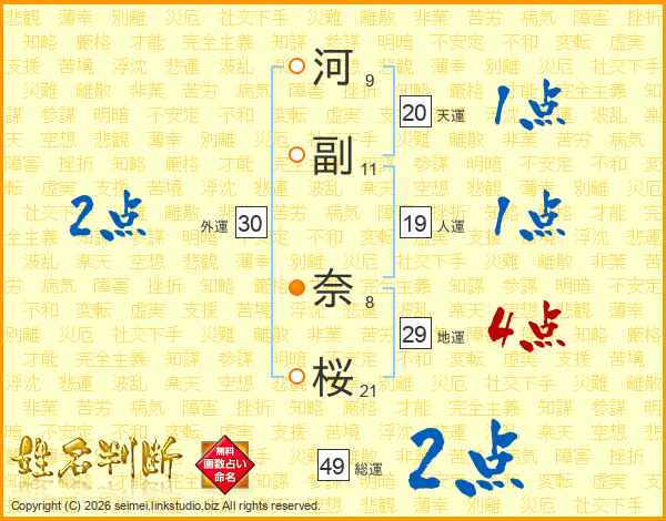 河(9画)副(11画) 奈(8画)桜(21画)