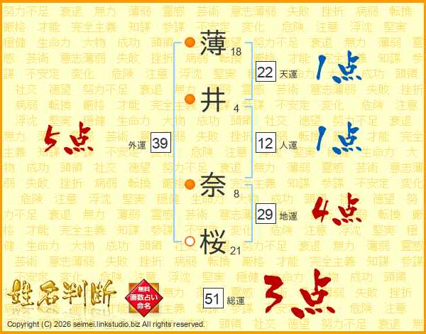 薄(18画)井(4画) 奈(8画)桜(21画)
