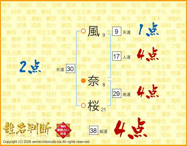 風奈桜さんの総運は38画の4点!