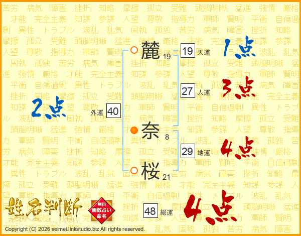 生活面を象徴する運勢です。外部から受ける影響力を表し、結婚運、家庭運や職場、環境への順応性を表します。総運から人運を引いた画数。姓や名が1文字の場合を除く。