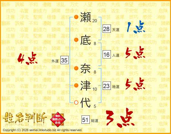 瀬(20画)底(8画) 奈(8画)津(10画)代(5画)