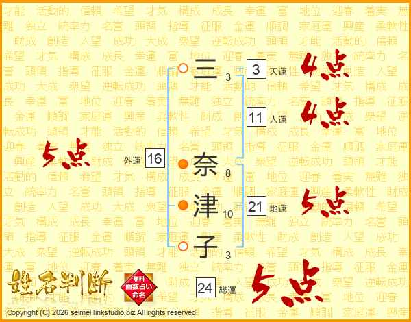 生活面を象徴する運勢です。外部から受ける影響力を表し、結婚運、家庭運や職場、環境への順応性を表します。総運から人運を引いた画数。姓や名が1文字の場合を除く。