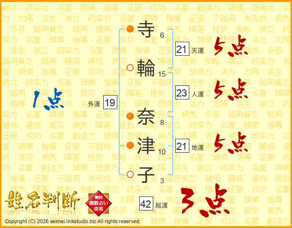 寺(6画)輪(15画) 奈(8画)津(10画)子(3画)