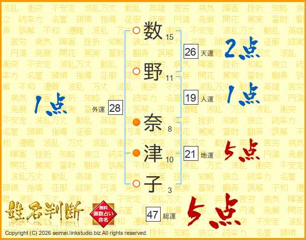 数(15画)野(11画) 奈(8画)津(10画)子(3画)