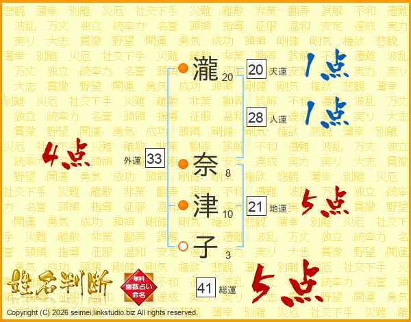 瀧(20画) 奈(8画)津(10画)子(3画)