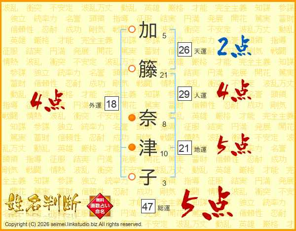 加(5画)籐(21画) 奈(8画)津(10画)子(3画)