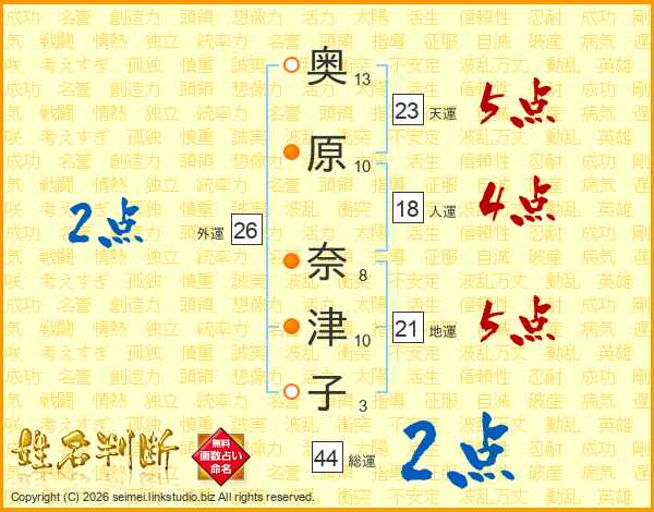 奥(13画)原(10画) 奈(8画)津(10画)子(3画)