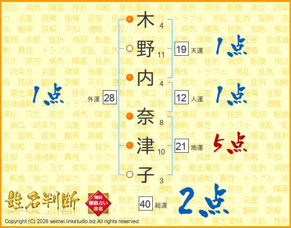 木(4画)野(11画)内(4画) 奈(8画)津(10画)子(3画)