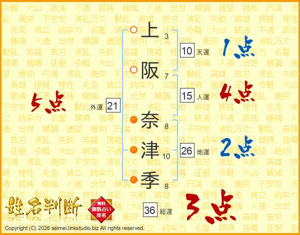上(3画)阪(7画) 奈(8画)津(10画)季(8画)