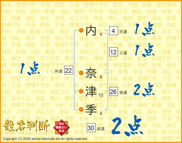 内(4画) 奈(8画)津(10画)季(8画)