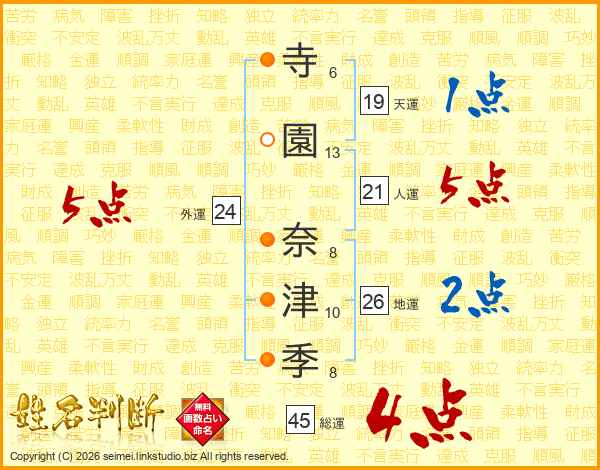 寺(6画)園(13画) 奈(8画)津(10画)季(8画)