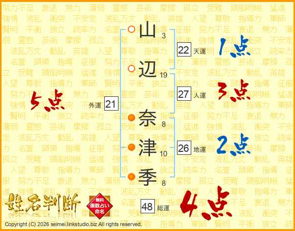 山(3画)辺(19画) 奈(8画)津(10画)季(8画)