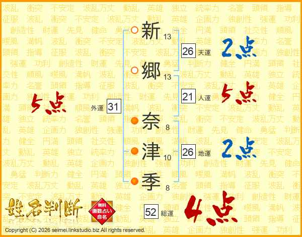 新(13画)郷(13画) 奈(8画)津(10画)季(8画)