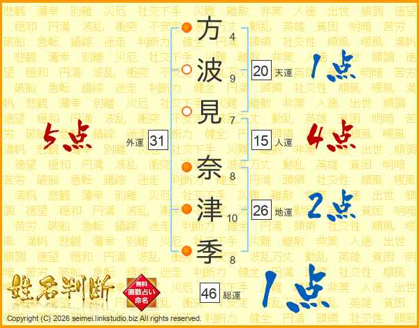 方(4画)波(9画)見(7画) 奈(8画)津(10画)季(8画)