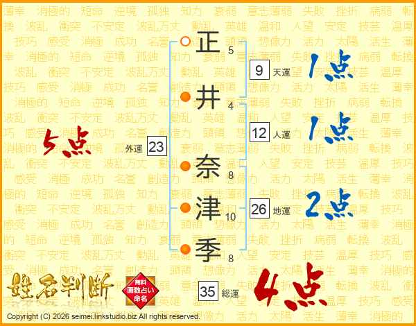 正(5画)井(4画) 奈(8画)津(10画)季(8画)