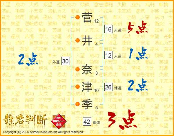 菅(12画)井(4画) 奈(8画)津(10画)季(8画)