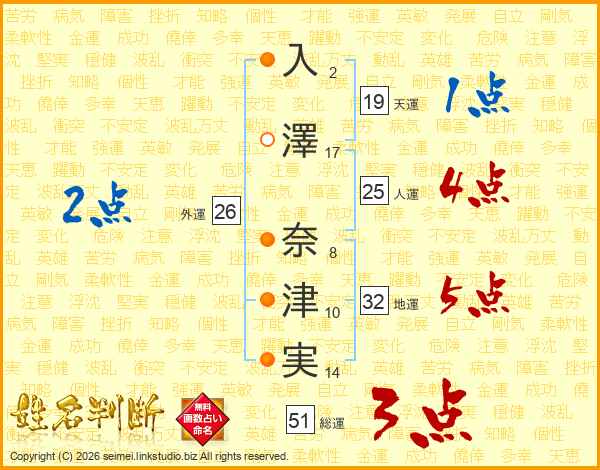 入(2画)澤(17画) 奈(8画)津(10画)実(14画)