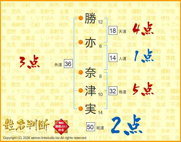 勝(12画)亦(6画) 奈(8画)津(10画)実(14画)
