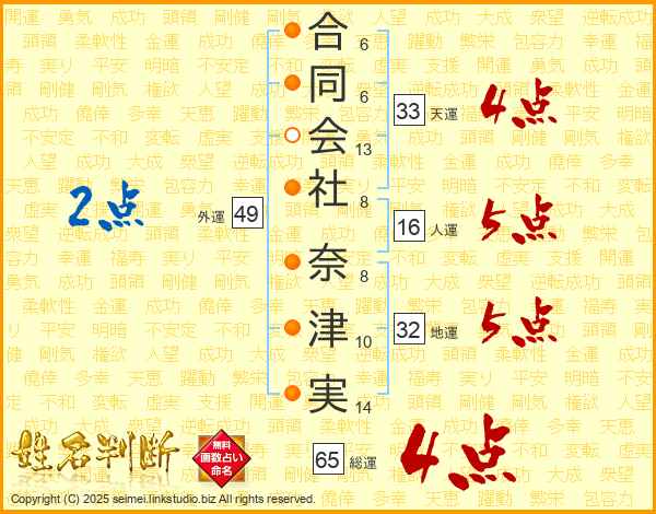 合(6画)同(6画)会(13画)社(8画) 奈(8画)津(10画)実(14画)