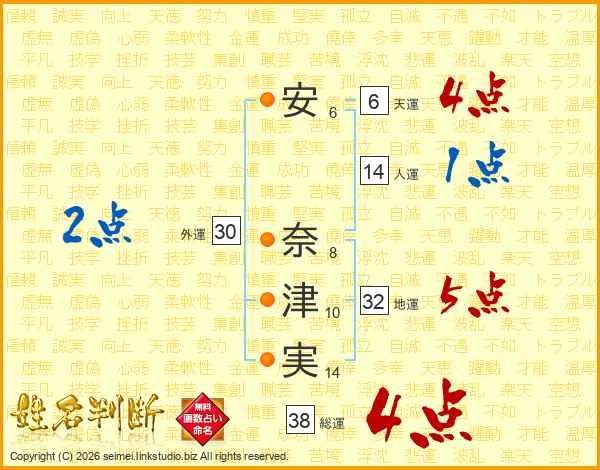 安(6画) 奈(8画)津(10画)実(14画)