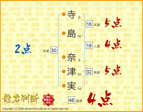 寺(6画)島(10画) 奈(8画)津(10画)実(14画)