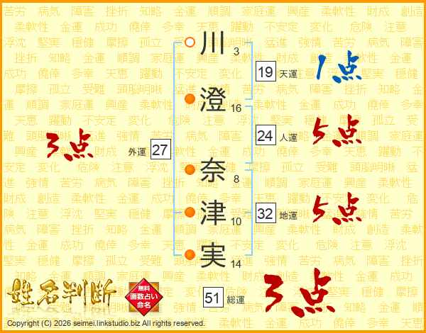 川(3画)澄(16画) 奈(8画)津(10画)実(14画)
