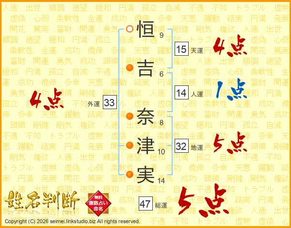 恒(9画)吉(6画) 奈(8画)津(10画)実(14画)