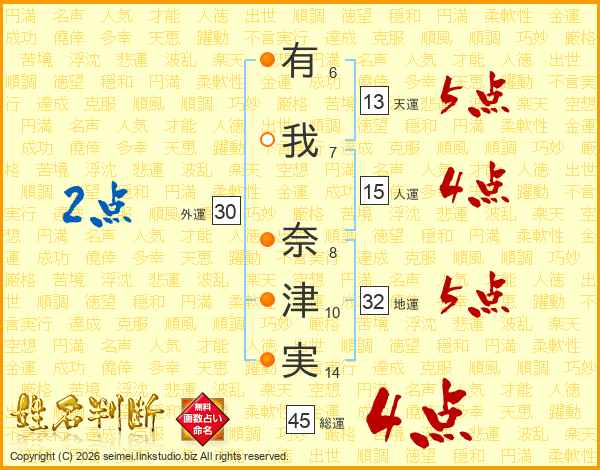 有(6画)我(7画) 奈(8画)津(10画)実(14画)