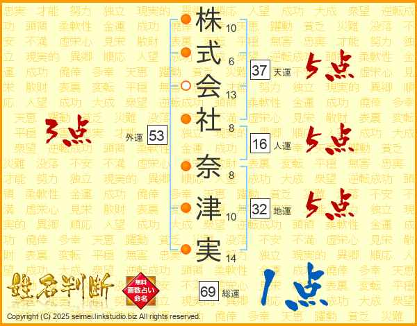 株(10画)式(6画)会(13画)社(8画) 奈(8画)津(10画)実(14画)