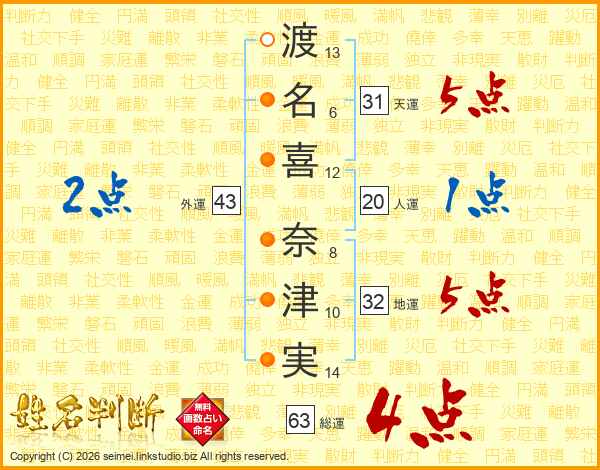 渡(13画)名(6画)喜(12画) 奈(8画)津(10画)実(14画)