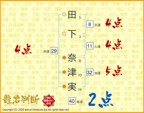 田(5画)下(3画) 奈(8画)津(10画)実(14画)