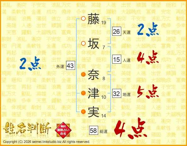 藤(19画)坂(7画) 奈(8画)津(10画)実(14画)
