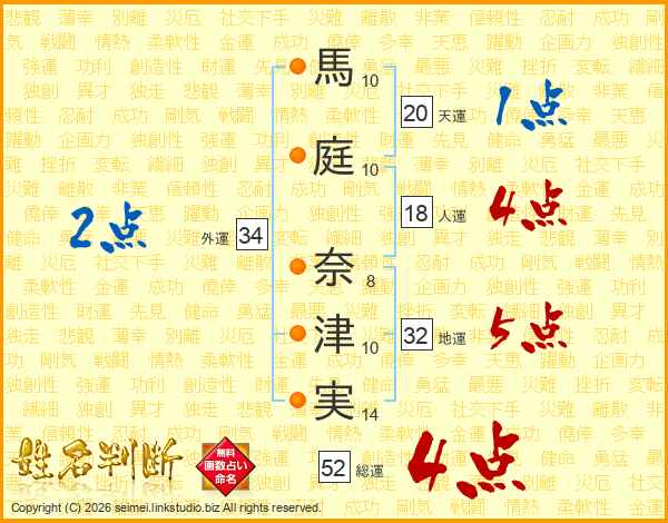 馬(10画)庭(10画) 奈(8画)津(10画)実(14画)