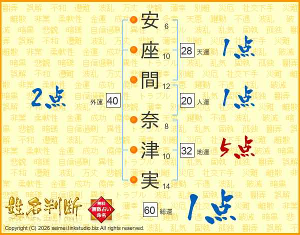 安(6画)座(10画)間(12画) 奈(8画)津(10画)実(14画)