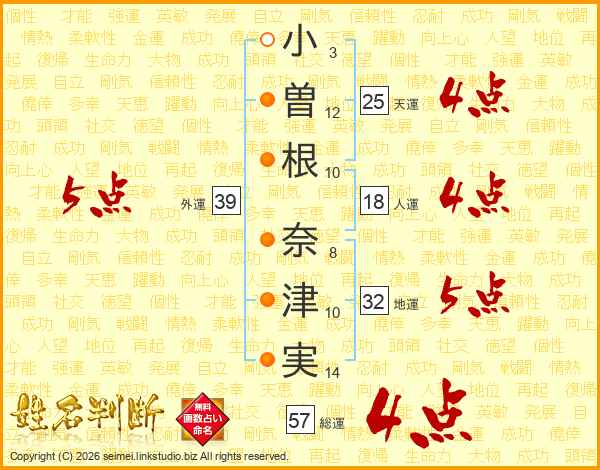 小(3画)曽(12画)根(10画) 奈(8画)津(10画)実(14画)