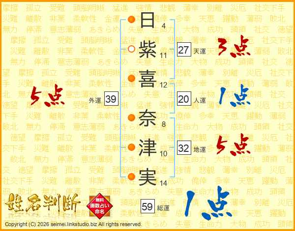 日(4画)紫(11画)喜(12画) 奈(8画)津(10画)実(14画)